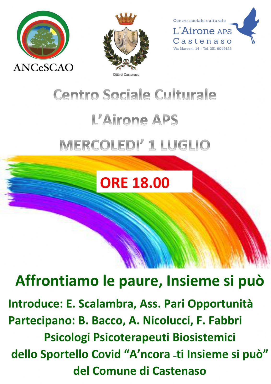 Con le colleghe di Castenaso è previsto per mercoledì 1 Luglio 2020 alle ore 18.00 presso il Centro Sociale Culturale l'Airone APS un incontro con la popolazione per affrontare insieme le paure legate alla pandemia di Covid-19.